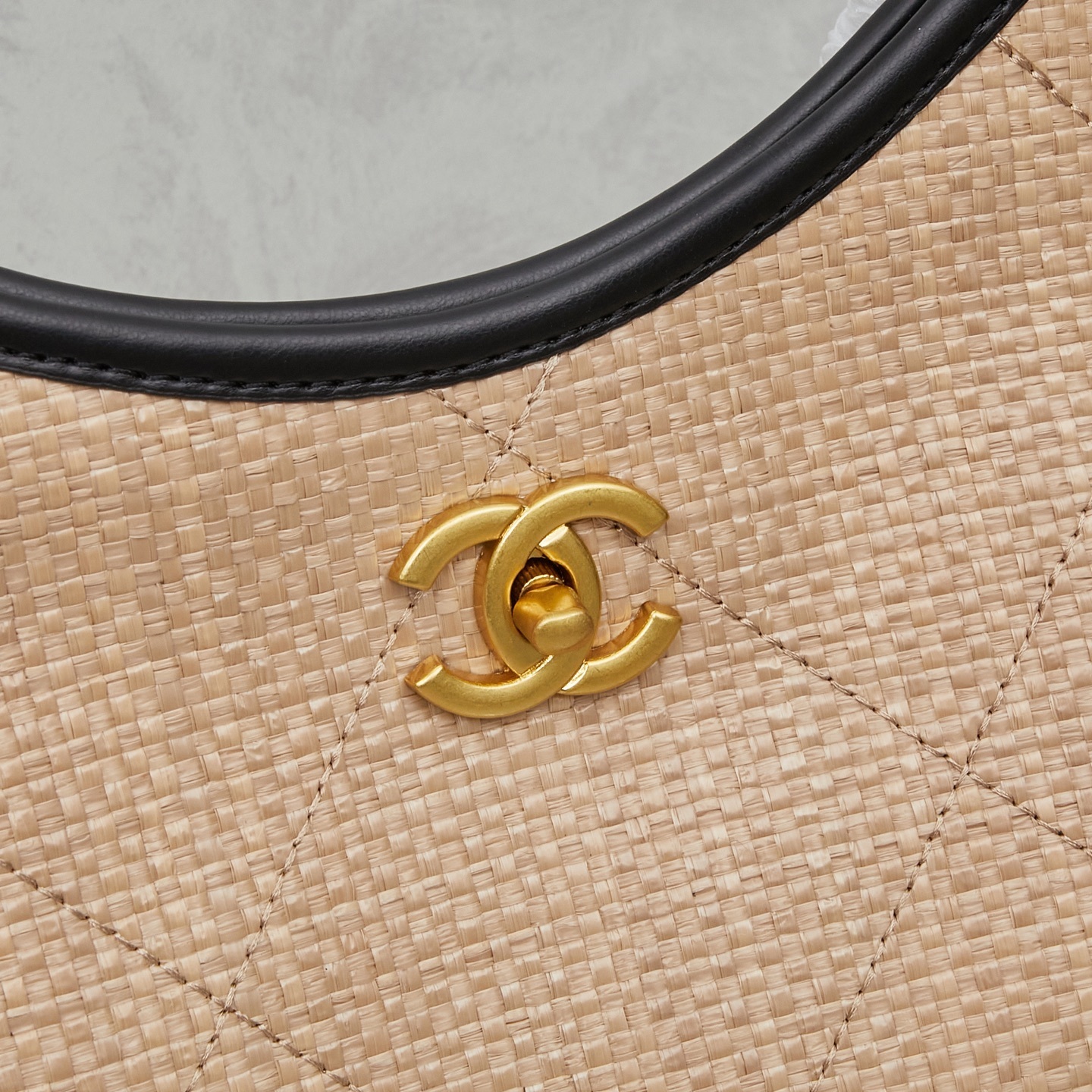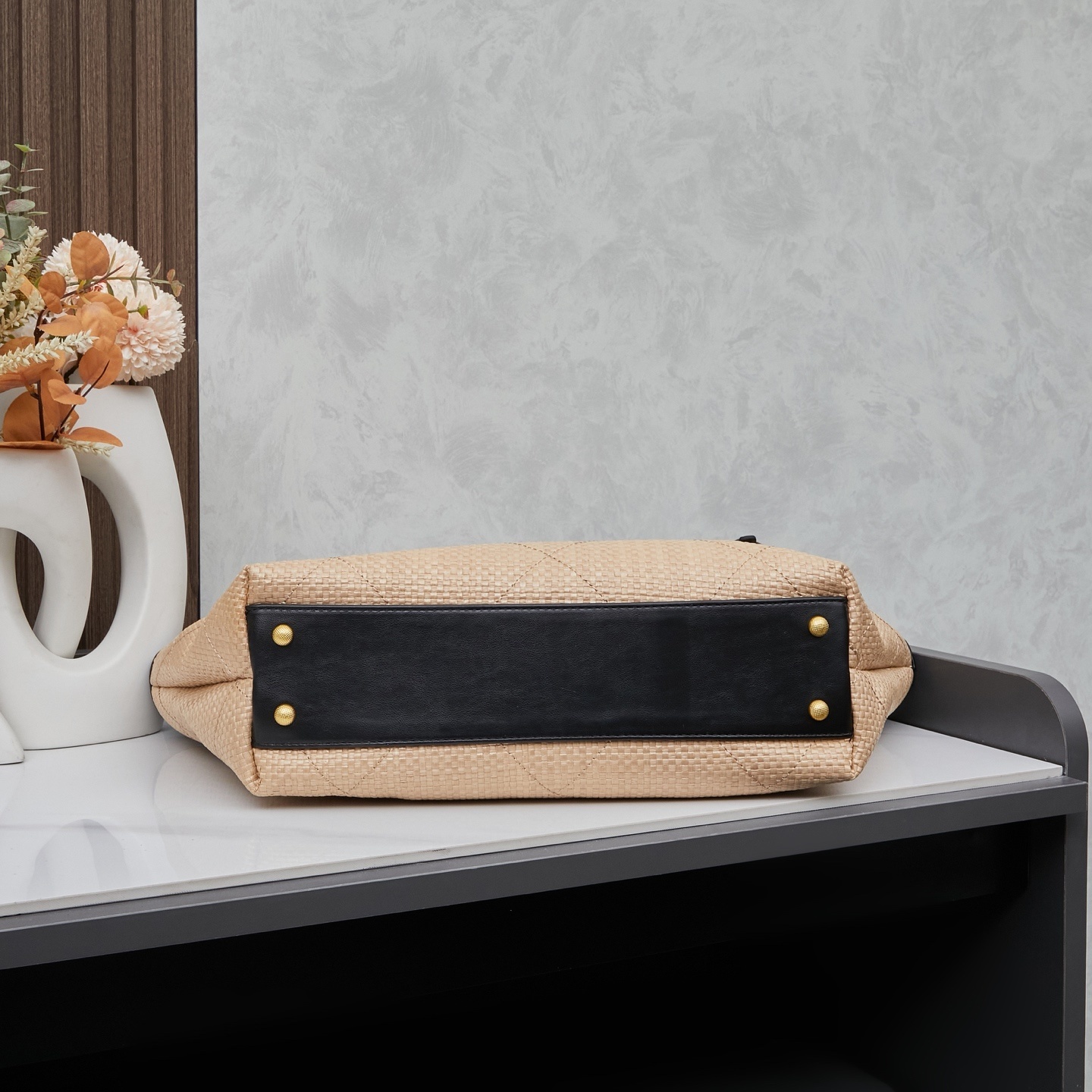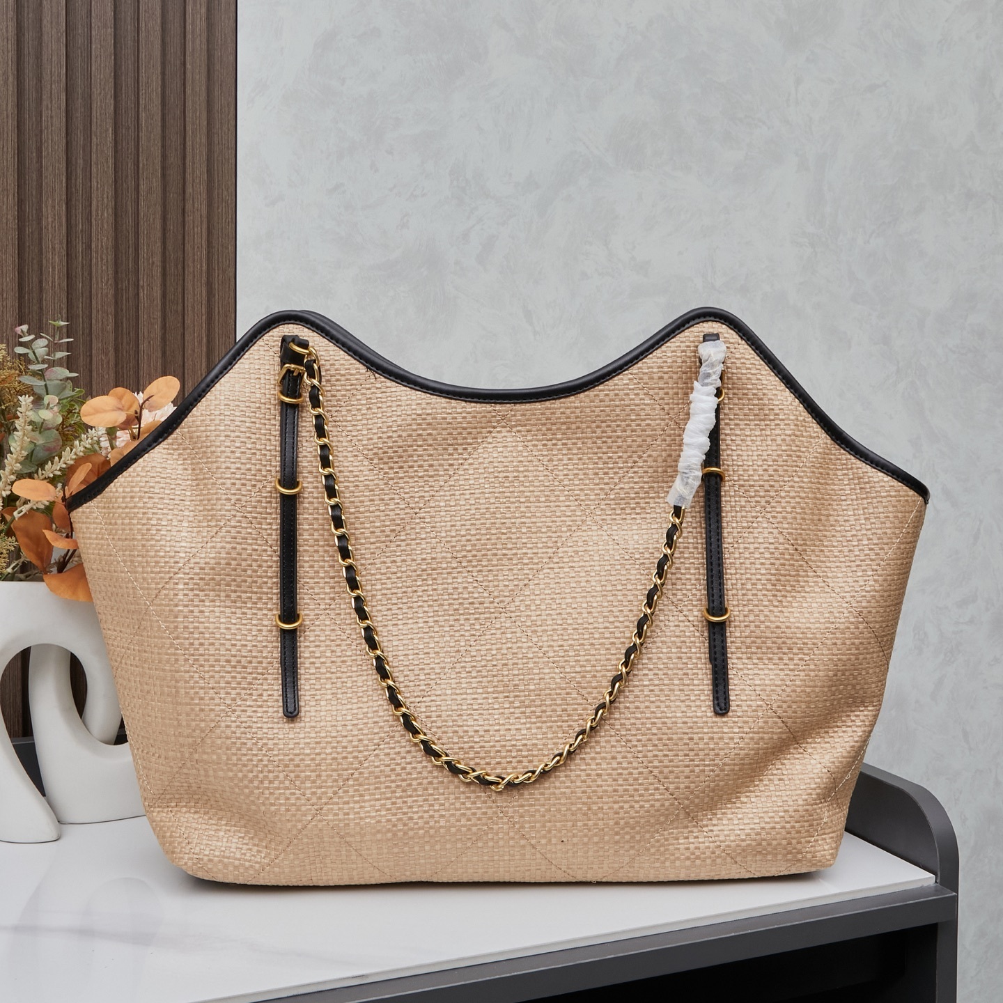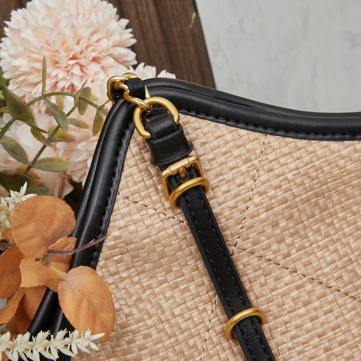 - Material: Woven raffia-style fabric with leather trim