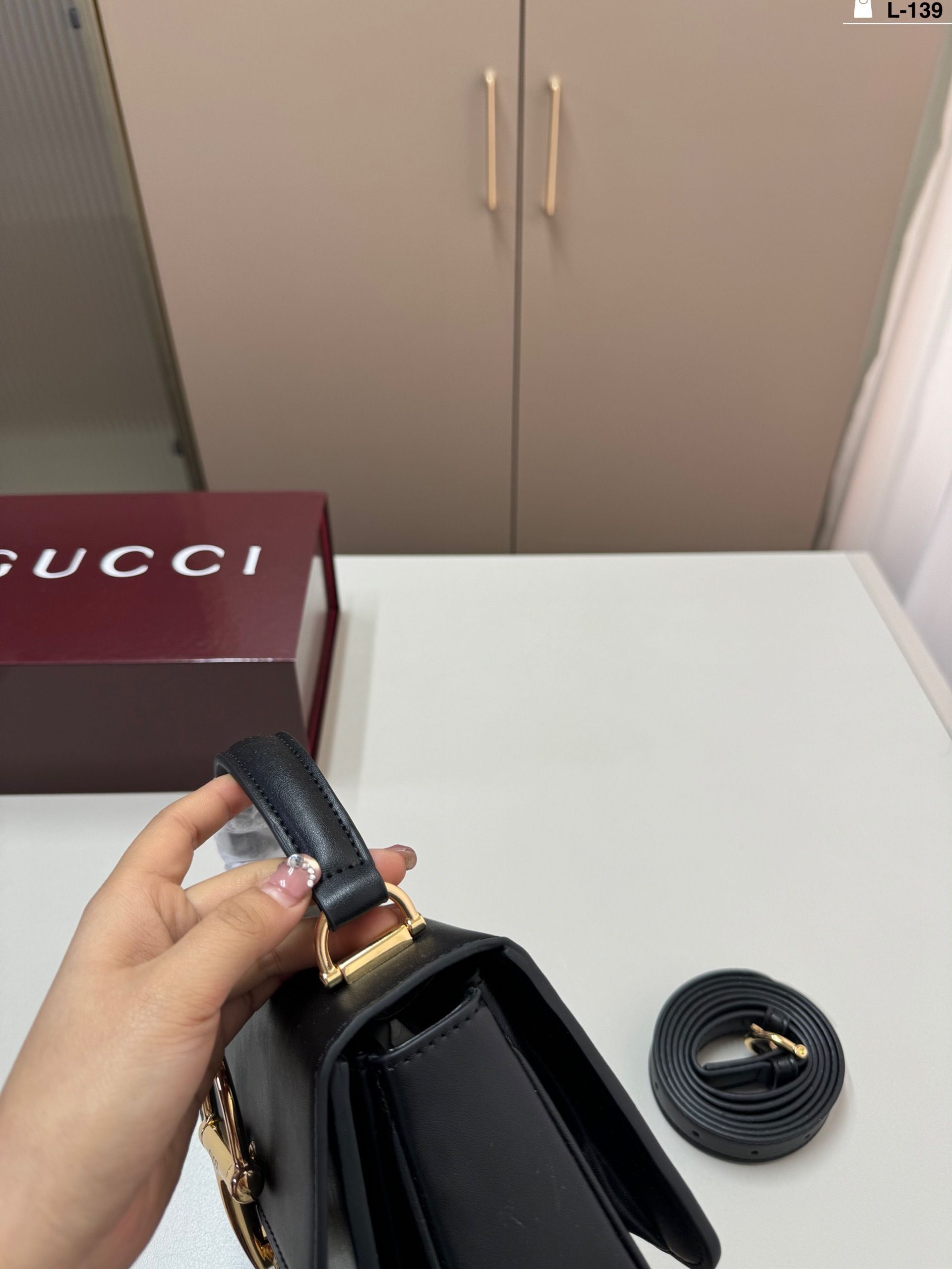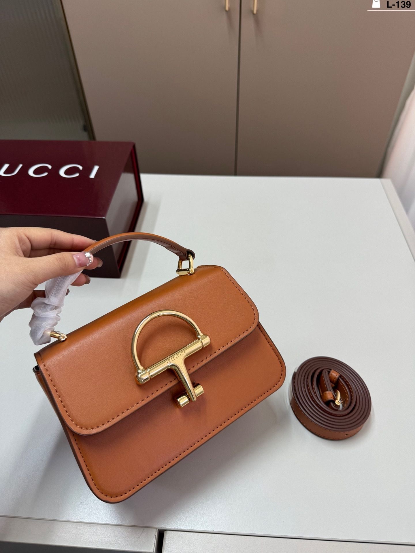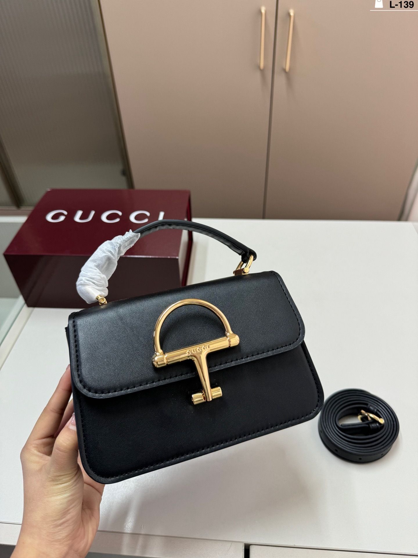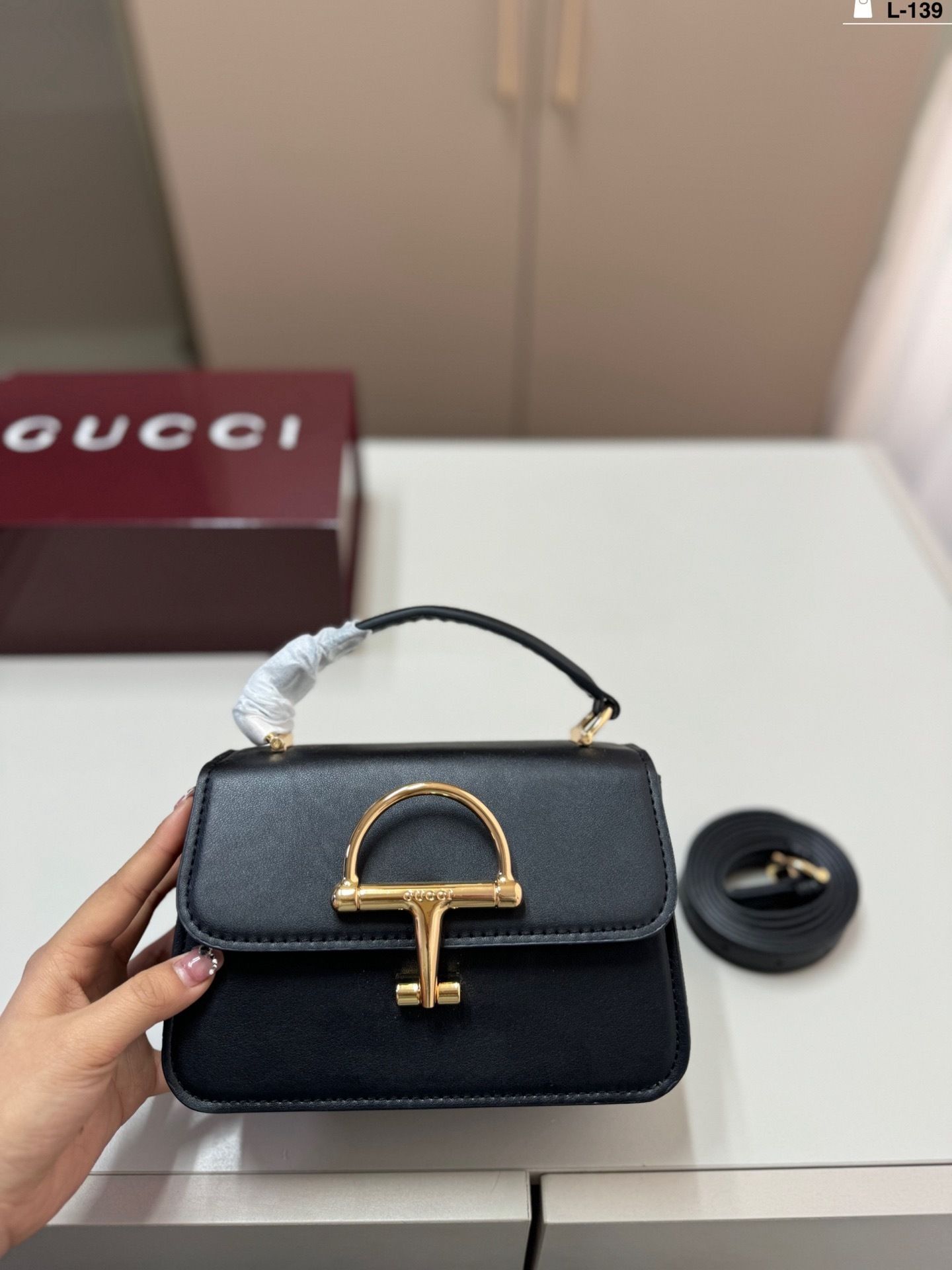 The highlight of the design is the oversized horsebit hardware in gold-tone metal, creating a bold focal point that reflects timeless heritage inspiration. The top handle adds a classic touch, while the detachable strap allows for effortless crossbody wear.