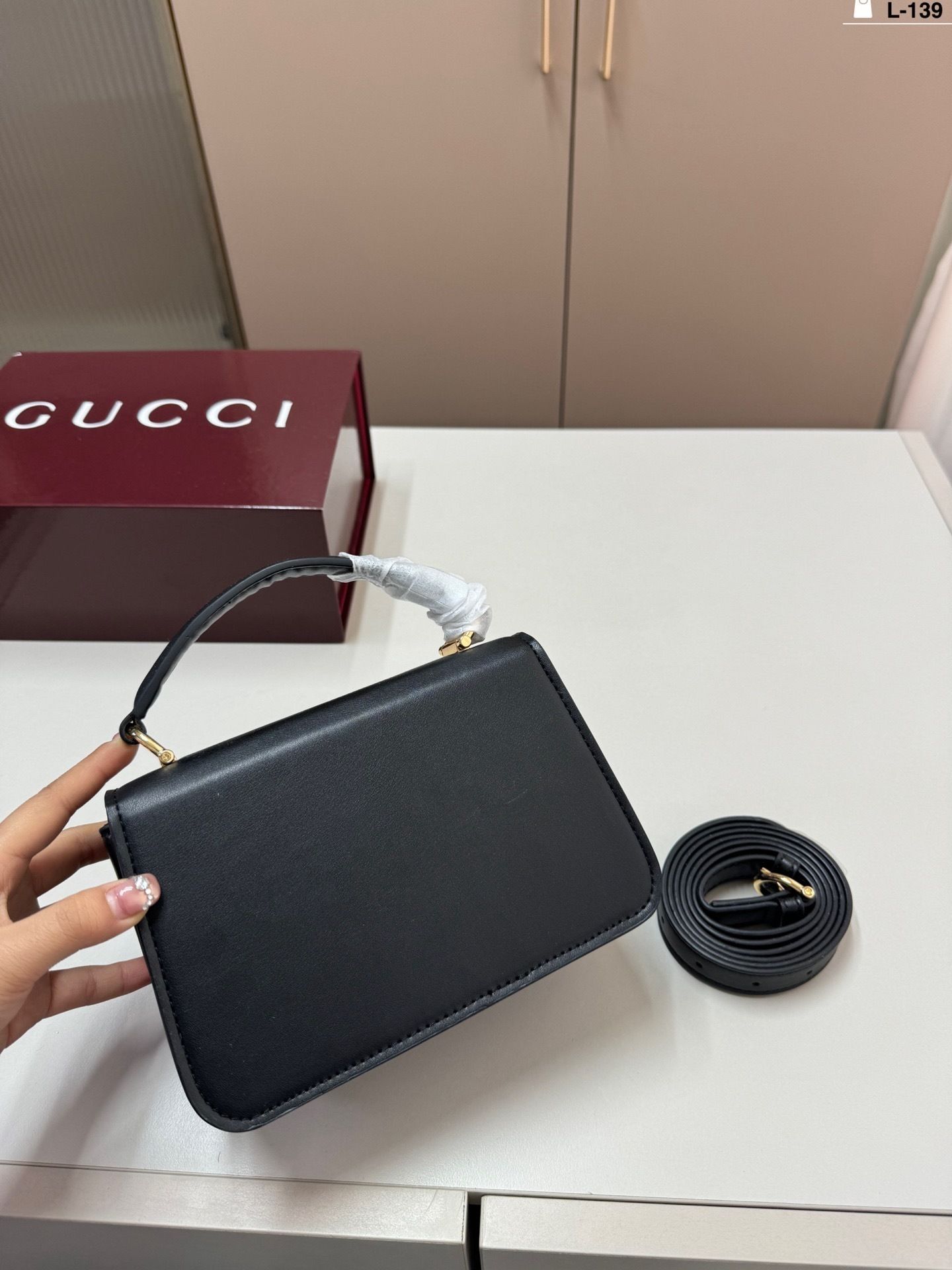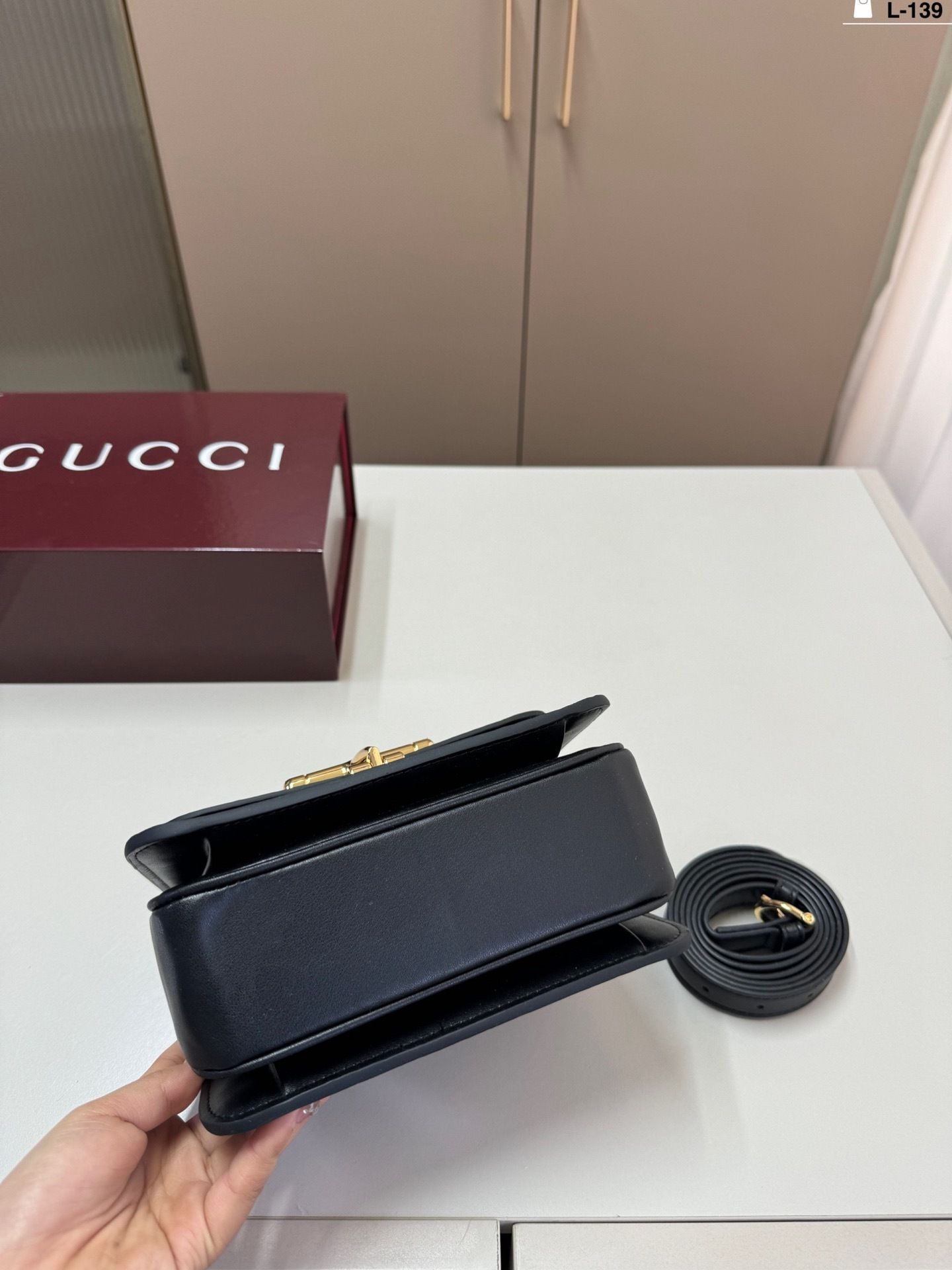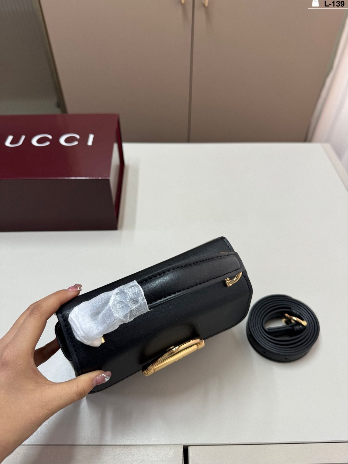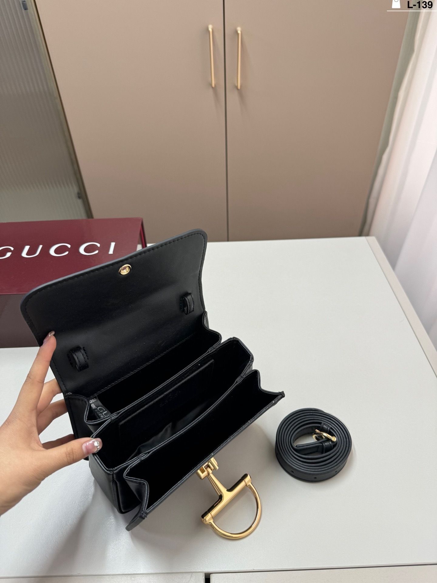 The highlight of the design is the oversized horsebit hardware in gold-tone metal, creating a bold focal point that reflects timeless heritage inspiration. The top handle adds a classic touch, while the detachable strap allows for effortless crossbody wear.